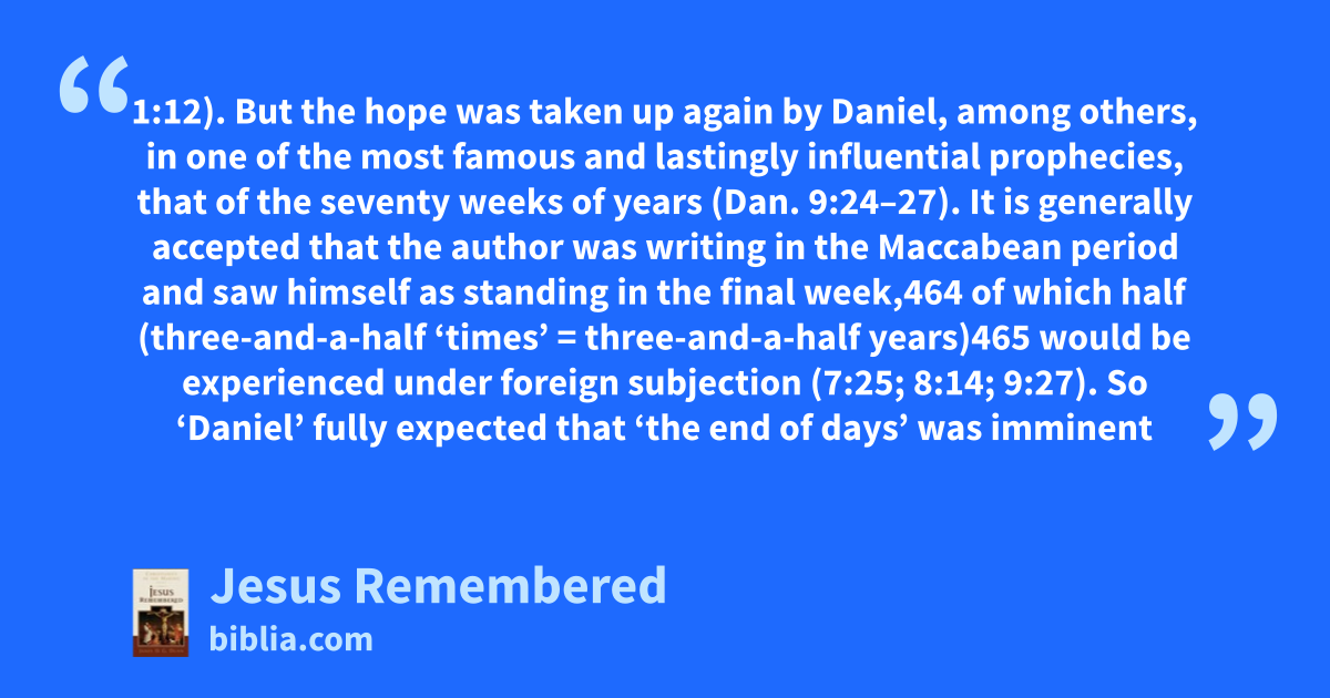 1:12). But the hope was taken up again by Daniel, among others, in one of the most famous and lastingly influential prophecies, that of the seventy weeks of years (Dan. 9:24–27). It is generally accepted that the author was writing in the Maccabean period and saw himself as standing in the final week,464 of which half (three-and-a-half ‘times’ = three-and-a-half years)465 would be experienced under foreign subjection (7:25; 8:14; 9:27). So ‘Daniel’ fully expected that ‘the end of days’ was imminent
