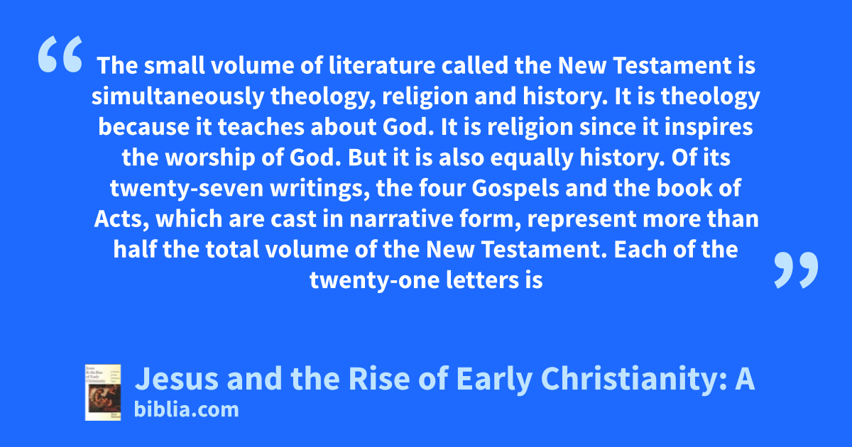 The small volume of literature called the New Testament is simultaneously theology, religion and history. It is theology because it teaches about God. It is religion since it inspires the worship of God. But it is also equally history. Of its twenty-seven writings, the four Gospels and the book of Acts, which are cast in narrative form, represent more than half the total volume of the New Testament. Each of the twenty-one letters is