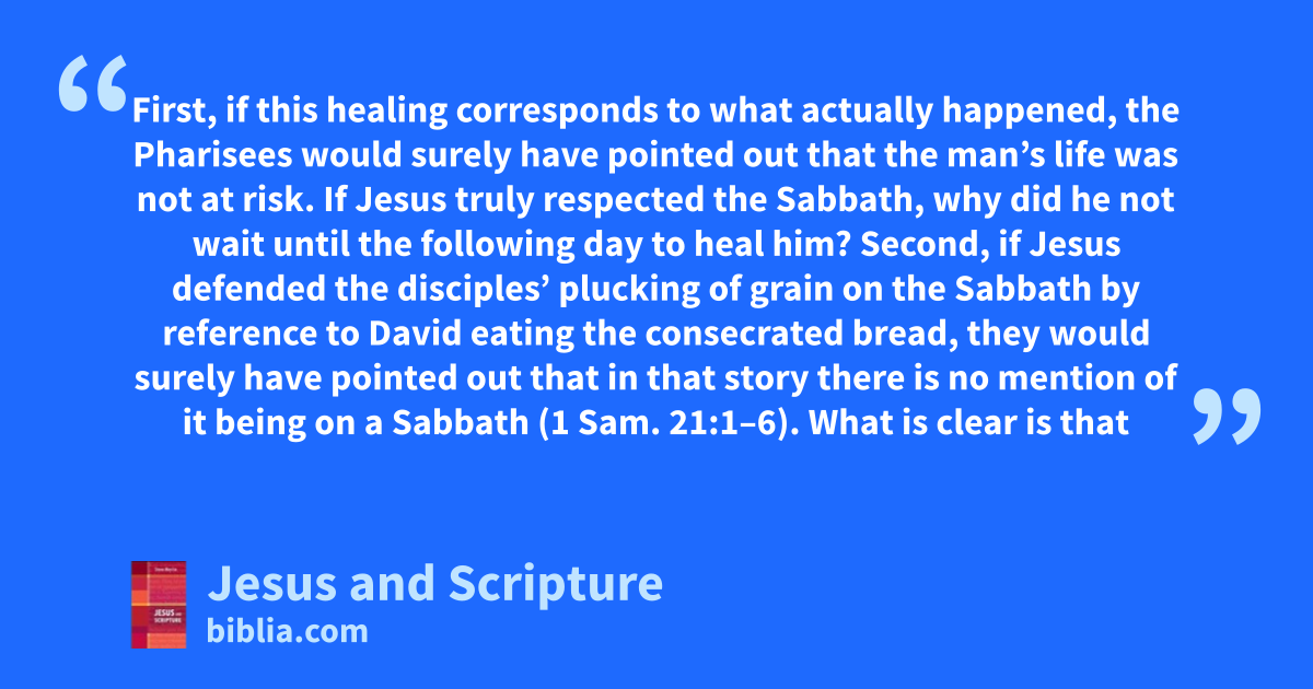 First, if this healing corresponds to what actually happened, the Pharisees would surely have pointed out that the man’s life was not at risk. If Jesus truly respected the Sabbath, why did he not wait until the following day to heal him? Second, if Jesus defended the disciples’ plucking of grain on the Sabbath by reference to David eating the consecrated bread, they would surely have pointed out that in that story there is no mention of it being on a Sabbath (1 Sam. 21:1–6). What is clear is that