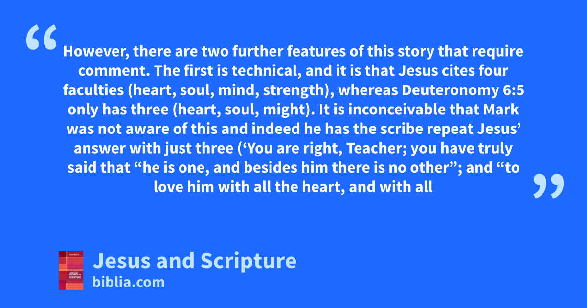 However, there are two further features of this story that require comment. The first is technical, and it is that Jesus cites four faculties (heart, soul, mind, strength), whereas Deuteronomy 6:5 only has three (heart, soul, might). It is inconceivable that Mark was not aware of this and indeed he has the scribe repeat Jesus’ answer with just three (‘You are right, Teacher; you have truly said that “he is one, and besides him there is no other”; and “to love him with all the heart, and with all
