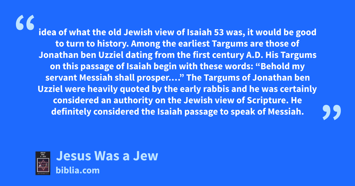 idea of what the old Jewish view of Isaiah 53 was, it would be good to turn to history. Among the earliest Targums are those of Jonathan ben Uzziel dating from the first century A.D. His Targums on this passage of Isaiah begin with these words: “Behold my servant Messiah shall prosper.…” The Targums of Jonathan ben Uzziel were heavily quoted by the early rabbis and he was certainly considered an authority on the Jewish view of Scripture. He definitely considered the Isaiah passage to speak of Messiah.