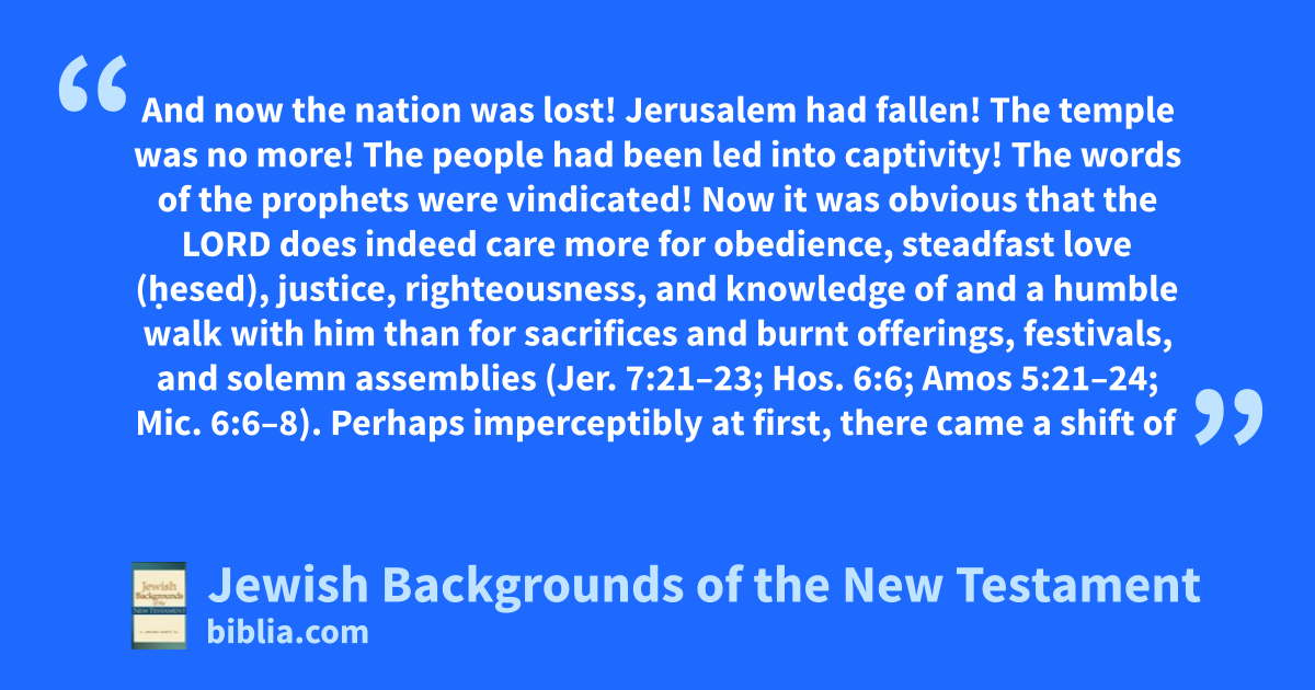 And now the nation was lost! Jerusalem had fallen! The temple was no more! The people had been led into captivity! The words of the prophets were vindicated! Now it was obvious that the LORD does indeed care more for obedience, steadfast love (ḥesed), justice, righteousness, and knowledge of and a humble walk with him than for sacrifices and burnt offerings, festivals, and solemn assemblies (Jer. 7:21–23; Hos. 6:6; Amos 5:21–24; Mic. 6:6–8). Perhaps imperceptibly at first, there came a shift of