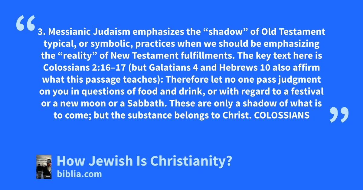 3. Messianic Judaism emphasizes the “shadow” of Old Testament typical, or symbolic, practices when we should be emphasizing the “reality” of New Testament fulfillments. The key text here is Colossians 2:16–17 (but Galatians 4 and Hebrews 10 also affirm what this passage teaches): Therefore let no one pass judgment on you in questions of food and drink, or with regard to a festival or a new moon or a Sabbath. These are only a shadow of what is to come; but the substance belongs to Christ. COLOSSIANS