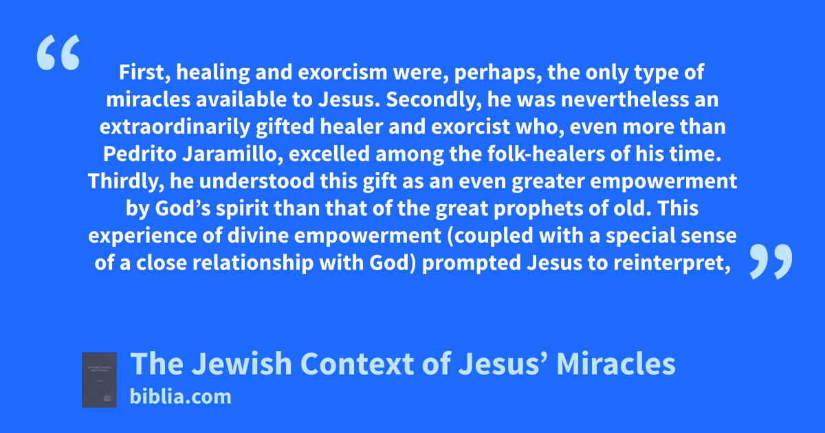 First, healing and exorcism were, perhaps, the only type of miracles available to Jesus. Secondly, he was nevertheless an extraordinarily gifted healer and exorcist who, even more than Pedrito Jaramillo, excelled among the folk-healers of his time. Thirdly, he understood this gift as an even greater empowerment by God’s spirit than that of the great prophets of old. This experience of divine empowerment (coupled with a special sense of a close relationship with God) prompted Jesus to reinterpret,
