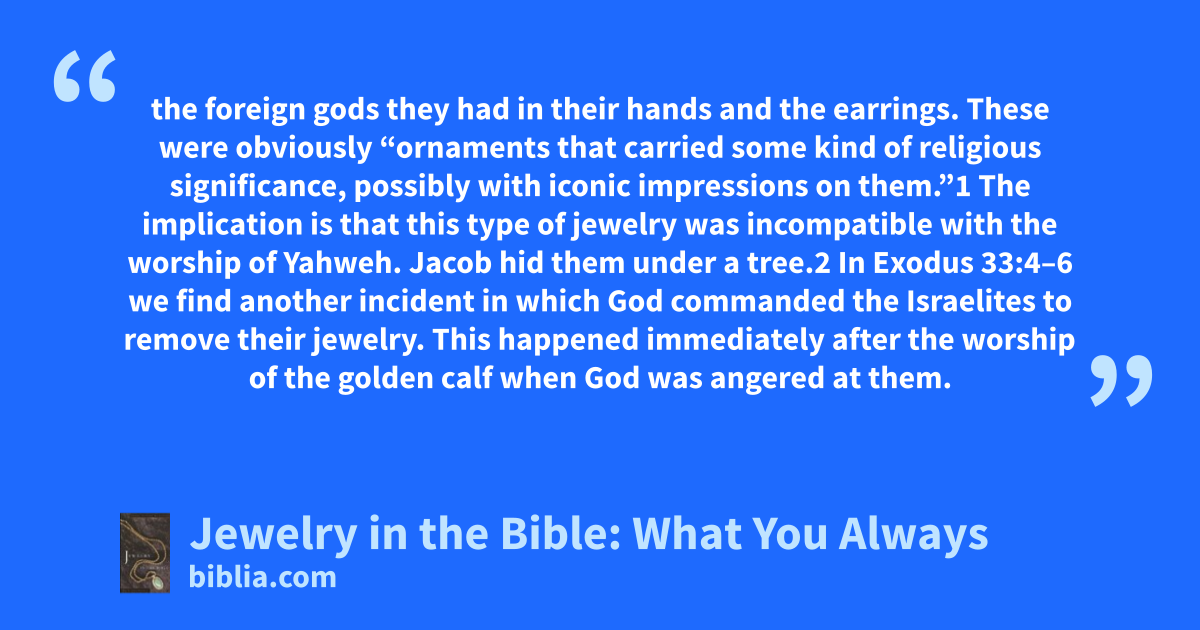 the foreign gods they had in their hands and the earrings. These were obviously “ornaments that carried some kind of religious significance, possibly with iconic impressions on them.”1 The implication is that this type of jewelry was incompatible with the worship of Yahweh. Jacob hid them under a tree.2 In Exodus 33:4–6 we find another incident in which God commanded the Israelites to remove their jewelry. This happened immediately after the worship of the golden calf when God was angered at them.