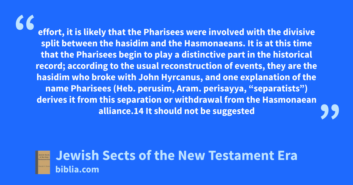 effort, it is likely that the Pharisees were involved with the divisive split between the hasidim and the Hasmonaeans. It is at this time that the Pharisees begin to play a distinctive part in the historical record; according to the usual reconstruction of events, they are the hasidim who broke with John Hyrcanus, and one explanation of the name Pharisees (Heb. perusim, Aram. perisayya, “separatists”) derives it from this separation or withdrawal from the Hasmonaean alliance.14 It should not be suggested