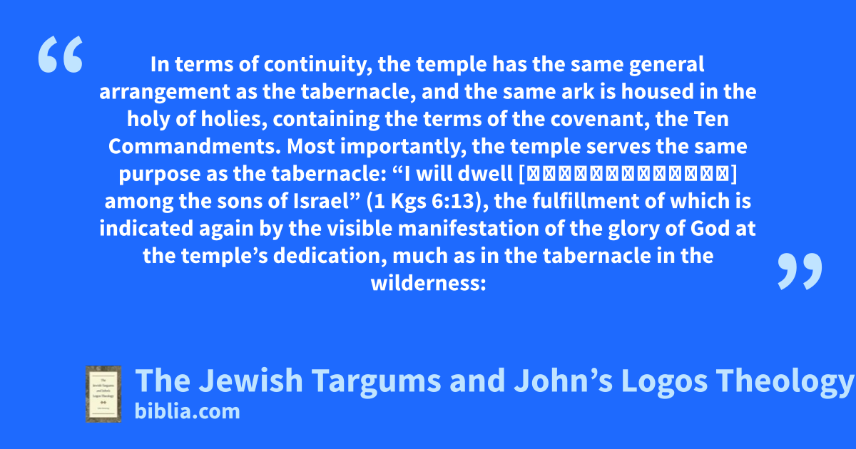 In terms of continuity, the temple has the same general arrangement as the tabernacle, and the same ark is housed in the holy of holies, containing the terms of the covenant, the Ten Commandments. Most importantly, the temple serves the same purpose as the tabernacle: “I will dwell [וְשָׁכַנְתִּי] among the sons of Israel” (1 Kgs 6:13), the fulfillment of which is indicated again by the visible manifestation of the glory of God at the temple’s dedication, much as in the tabernacle in the wilderness: