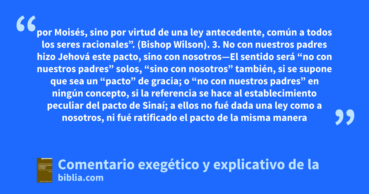por Moisés, sino por virtud de una ley antecedente, común a todos los seres racionales”. (Bishop Wilson). 3. No con nuestros padres hizo Jehová este pacto, sino con nosotros—El sentido será “no con nuestros padres” solos, “sino con nosotros” también, si se supone que sea un “pacto” de gracia; o “no con nuestros padres” en ningún concepto, si la referencia se hace al establecimiento peculiar del pacto de Sinaí; a ellos no fué dada una ley como a nosotros, ni fué ratificado el pacto de la misma manera