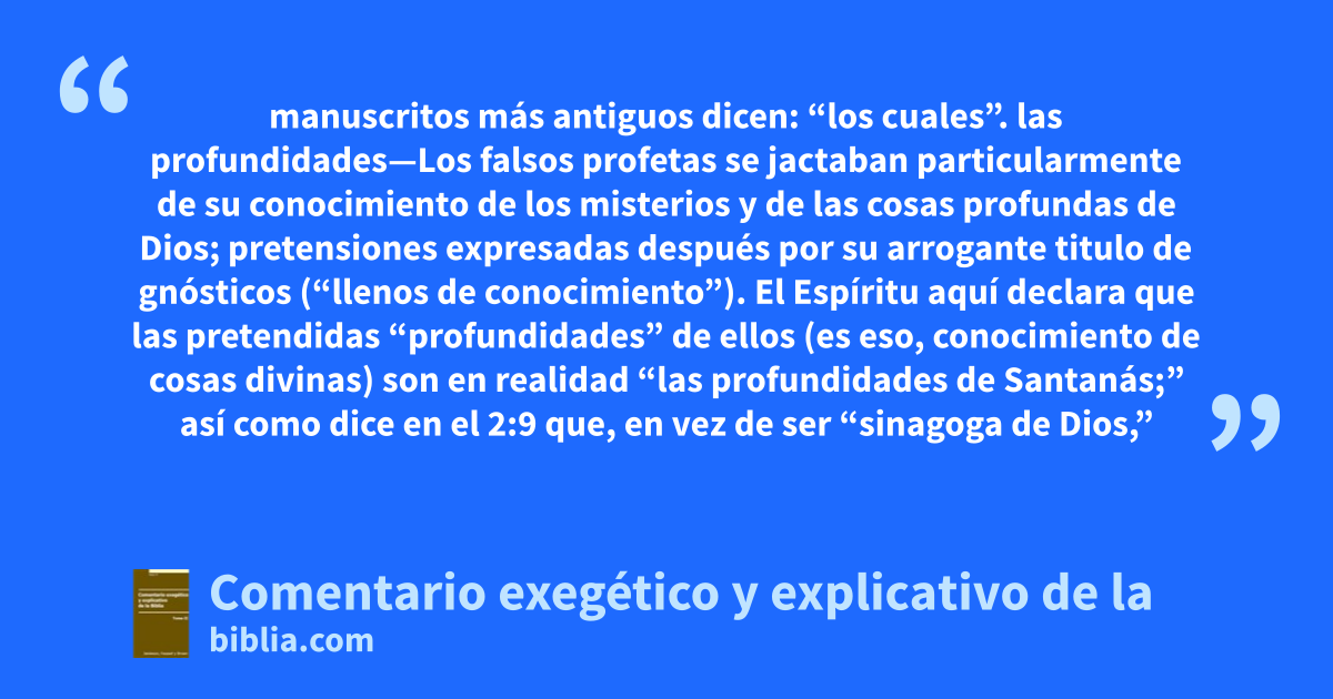 manuscritos más antiguos dicen: “los cuales”. las profundidades—Los falsos profetas se jactaban particularmente de su conocimiento de los misterios y de las cosas profundas de Dios; pretensiones expresadas después por su arrogante titulo de gnósticos (“llenos de conocimiento”). El Espíritu aquí declara que las pretendidas “profundidades” de ellos (es eso, conocimiento de cosas divinas) son en realidad “las profundidades de Santanás;” así como dice en el 2:9 que, en vez de ser “sinagoga de Dios,”