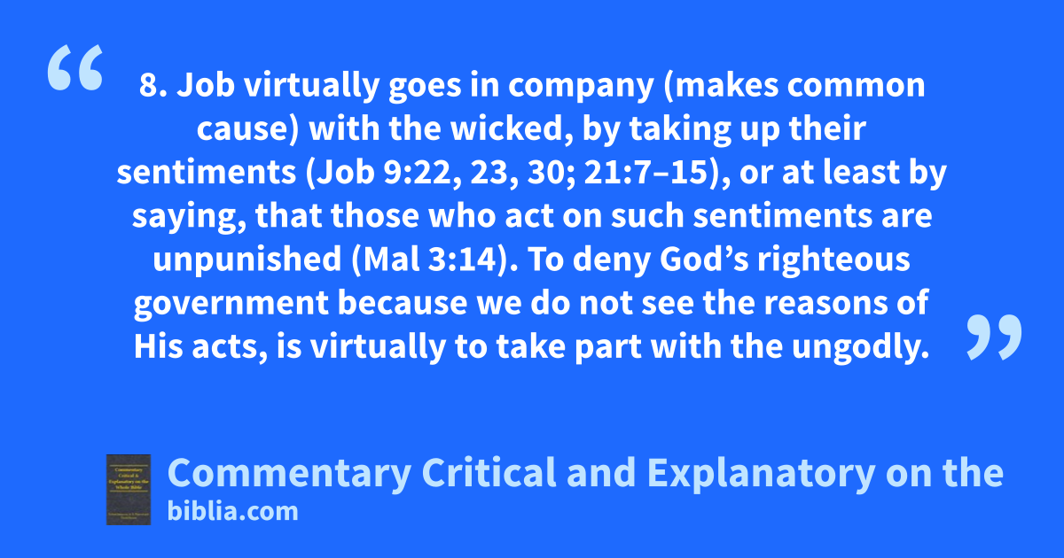 8. Job virtually goes in company (makes common cause) with the wicked, by taking up their sentiments (Job 9:22, 23, 30; 21:7–15), or at least by saying, that those who act on such sentiments are unpunished (Mal 3:14). To deny God’s righteous government because we do not see the reasons of His acts, is virtually to take part with the ungodly.