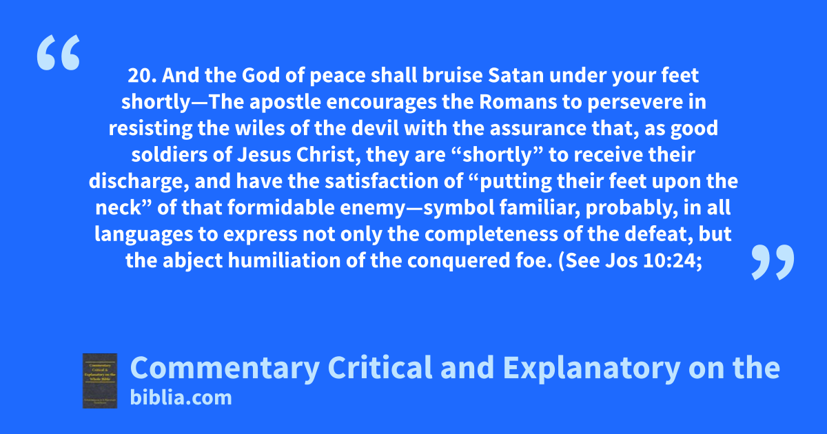 20. And the God of peace shall bruise Satan under your feet shortly—The apostle encourages the Romans to persevere in resisting the wiles of the devil with the assurance that, as good soldiers of Jesus Christ, they are “shortly” to receive their discharge, and have the satisfaction of “putting their feet upon the neck” of that formidable enemy—symbol familiar, probably, in all languages to express not only the completeness of the defeat, but the abject humiliation of the conquered foe. (See Jos 10:24; 2 Sa 22:41; Ez 21:29; Ps 91:13). Though the apostle here styles Him who is thus to bruise Satan, the God of peace,” with special reference to the “divisions” (Ro 16:17) by which the church at Rome was in danger of being disturbed, this sublime appellation of God has here a wider sense, pointing to the whole “purpose for which the Son of God was manifested, to destroy the works of the devil” (1 Jn 3:8); and indeed this assurance is but a reproduction of the first great promise, that the Seed of the woman should bruise the Serpent’s head (Ge 3:15).