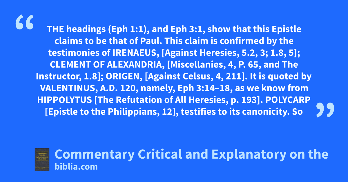 The headings (Eph 1:1), and Eph 3:1, show that this Epistle claims to be that of Paul. This claim is confirmed by the testimonies of Irenaeus, [Against Heresies, 5.2, 3; 1.8, 5]; Clement of Alexandria, [Miscellanies, 4, P. 65, and The Instructor, 1.8]; Origen, [Against Celsus, 4, 211]. It is quoted by Valentinus, a.d. 120, namely, Eph 3:14–18, as we know from Hippolytus [The Refutation of All Heresies, p. 193]. Polycarp [Epistle to the Philippians, 12], testifies to its canonicity. So Tertullian [Against Marcion, 5, 17]. Ignatius [Epistle to the Ephesians, 12], which alludes to the frequent and affectionate mention made by Paul of the Christian state, privileges, and persons of the Ephesians in his Epistle.