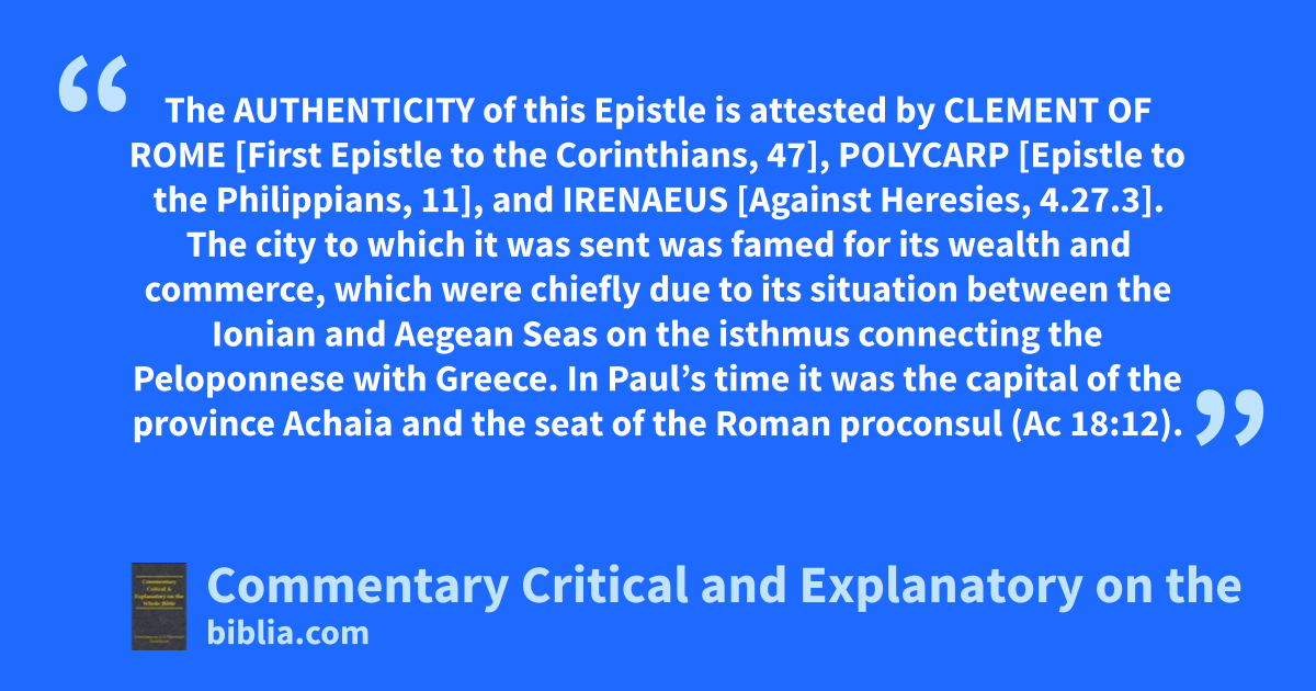 The Authenticity of this Epistle is attested by Clement of Rome [First Epistle to the Corinthians, 47], Polycarp [Epistle to the Philippians, 11], and Irenaeus [Against Heresies, 4.27.3]. The city to which it was sent was famed for its wealth and commerce, which were chiefly due to its situation between the Ionian and Aegean Seas on the isthmus connecting the Peloponnese with Greece. In Paul’s time it was the capital of the province Achaia and the seat of the Roman proconsul (Ac 18:12). The state of morals in it was notorious for debauchery, even in the profligate heathen world; so much so that “to Corinthianize” was a proverbial phrase for “to play the wanton”; hence arose dangers to the purity of the Christian Church at Corinth. That Church was founded by Paul on his first visit (Ac 18:1–17).