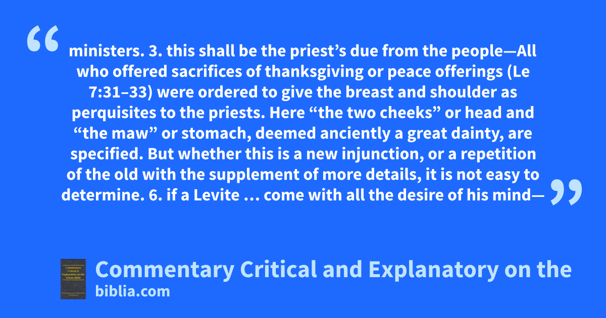 3. this shall be the priest’s due from the people—All who offered sacrifices of thanksgiving or peace offerings (Le 7:31–33) were ordered to give the breast and shoulder as perquisites to the priests. Here “the two cheeks” or head and “the maw” or stomach, deemed anciently a great dainty, are specified. But whether this is a new injunction, or a repetition of the old with the supplement of more details, it is not easy to determine.