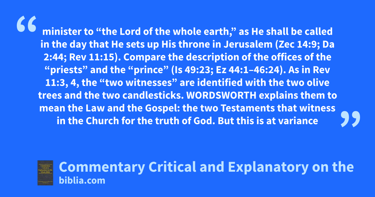 11, 12. Zechariah three times (Zec 4:4, 11, 12) asks as to the two olives before he gets an answer; the question becomes more minute each time. What he at first calls “two olive trees,” he afterwards calls “branches,” as on closer looking he observes that the “branches” of the trees are the channels through which a continual flow of oil dropped into the bowl of the lamps (Zec 4:2), and that this is the purpose for which the two olive trees stand beside the candlestick. Primarily, the “two” refer to Joshua and Zerubbabel. God, says Auberlen, at each of the transition periods of the world’s history has sent great men to guide the Church. So the two witnesses shall appear before the destruction of Antichrist. Antitypically, “the two anointed ones” (Zec 4:14) are the twofold supports of the Church, the civil power (answering to Zerubbabel) and the ecclesiastical (answering to Joshua, the high priest), which in the restored Jewish polity and temple shall “stand by,” that is, minister to “the Lord of the whole earth,” as He shall be called in the day that He sets up His throne in Jerusalem (Zec 14:9; Da 2:44; Rev 11:15). Compare the description of the offices of the “priests” and the “prince” (Is 49:23; Ez 44:1–46:24). As in Rev 11:3, 4, the “two witnesses” are identified with the two olive trees and the two candlesticks. Wordsworth explains them to mean the Law and the Gospel: the two Testaments that witness in the Church for the truth of God. But this is at variance with the sense here, which requires Joshua and Zerubbabel to be primarily meant. So Moses (the prophet and lawgiver) and Aaron (the high priest) ministered to the Lord among the covenant-people at the exodus; Ezekiel (the priest) and Daniel (a ruler) in the Babylonian captivity; so it shall be in restored Israel. Some think Elijah will appear again (compare the transfiguration, Mt 17:3, 11, with Mal 4:4, 5; Jn 1:21) with Moses. Rev 11:6, which mentions the very miracles performed by Elijah and Moses (shutting heaven so as not to rain, and turning water into blood), favors this (compare Ex 7:19; 1 Ki 17:1; Lu 4:25; Jam 5:16, 17). The period is the same, “three years and six months”; the scene also is in Israel (Rev 11:8), “where our Lord was crucified.” It is supposed that for the first three and a half years of the hebdomad (Da 9:20–27), God will be worshipped in the temple; in the latter three and a half years, Antichrist will break the covenant (Da 9:27), and set himself up in the temple to be worshipped as God (2 Th 2:4). The witnesses prophesy the former three and a half years, while corruptions prevail and faith is rare (Lu 18:8); then they are slain and remain dead three and a half years. Probably, besides individual witnesses and literal years, there is a fulfilment in long periods and general witnesses, such as the Church and the Word, the civil and religious powers so far as they have witnessed for God. So “the beast” in Revelation answers to the civil power of the apostasy; “the false prophet” to the spiritual power. Man needs the priest to atone for guilt, and the prophet-king to teach holiness with kingly authority. These two typically united in Melchisedek were divided between two till they meet in Messiah, the Antitype. Zec 6:11–13 accords with this. The Holy Spirit in this His twofold power of applying to man the grace of the atonement, and that of sanctification, must in one point of view be meant by the two olive trees which supply the bowl at the top of the candlestick (that is, Messiah at the head of the Church); for it is He who filled Jesus with all the fulness of His unction (Jn 3:34). But this does not exclude the primary application to Joshua and Zerubbabel, “anointed” (Zec 4:14) with grace to minister to the Jewish Church: and so applicable to the twofold supports of the Church which are anointed with the Spirit, the prince and the priest, or minister.