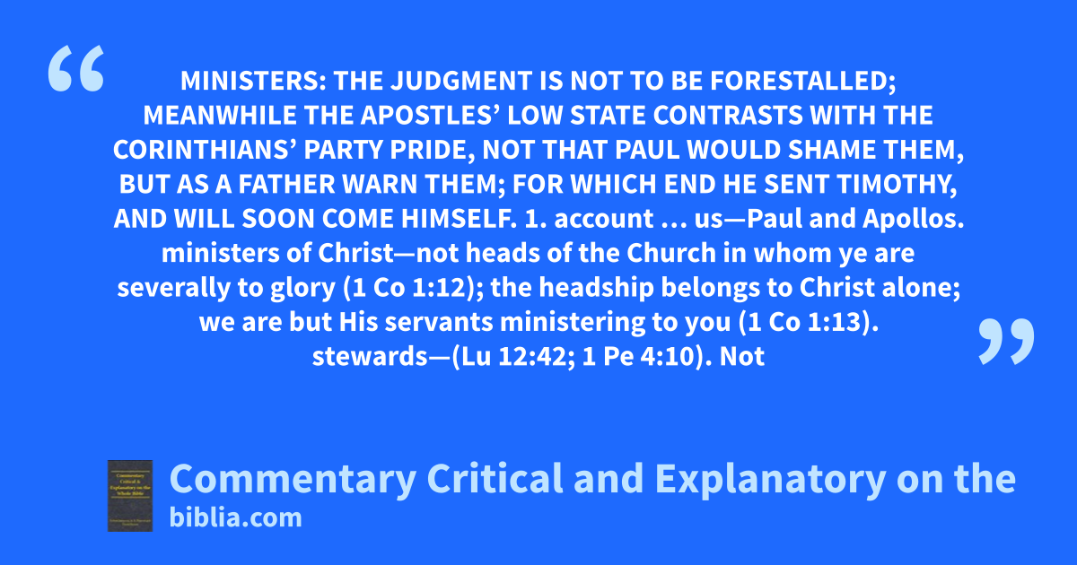 1 Co 4:1–21. True View of Ministers: The Judgment Is Not to Be Forestalled; Meanwhile the Apostles’ Low State Contrasts with the Corinthians’ Party Pride, Not That Paul Would Shame Them, but as a Father Warn Them; for Which End He Sent Timothy, and Will Soon Come Himself.