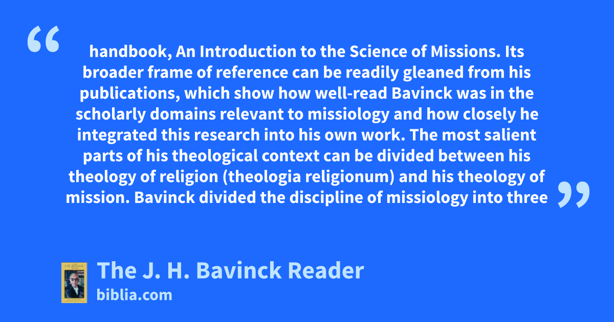 handbook, An Introduction to the Science of Missions. Its broader frame of reference can be readily gleaned from his publications, which show how well-read Bavinck was in the scholarly domains relevant to missiology and how closely he integrated this research into his own work. The most salient parts of his theological context can be divided between his theology of religion (theologia religionum) and his theology of mission. Bavinck divided the discipline of missiology into three