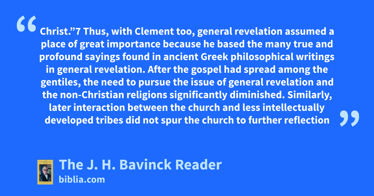 Christ.”7 Thus, with Clement too, general revelation assumed a place of great importance because he based the many true and profound sayings found in ancient Greek philosophical writings in general revelation. After the gospel had spread among the gentiles, the need to pursue the issue of general revelation and the non-Christian religions significantly diminished. Similarly, later interaction between the church and less intellectually developed tribes did not spur the church to further reflection