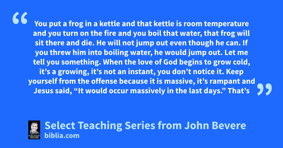 You put a frog in a kettle and that kettle is room temperature and you turn on the fire and you boil that water, that frog will sit there and die. He will not jump out even though he can. If you threw him into boiling water, he would jump out. Let me tell you something. When the love of God begins to grow cold, it’s a growing, it’s not an instant, you don’t notice it. Keep yourself from the offense because it is massive, it’s rampant and Jesus said, “It would occur massively in the last days.” That’s