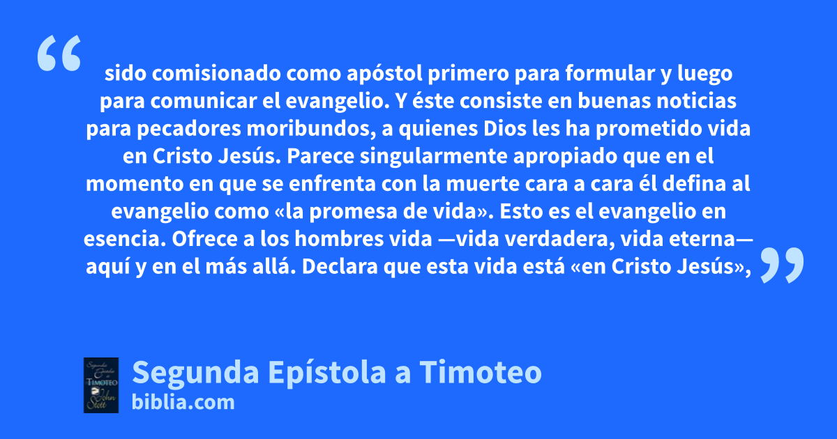 sido comisionado como apóstol primero para formular y luego para comunicar el evangelio. Y éste consiste en buenas noticias para pecadores moribundos, a quienes Dios les ha prometido vida en Cristo Jesús. Parece singularmente apropiado que en el momento en que se enfrenta con la muerte cara a cara él defina al evangelio como «la promesa de vida». Esto es el evangelio en esencia. Ofrece a los hombres vida —vida verdadera, vida eterna— aquí y en el más allá. Declara que esta vida está «en Cristo Jesús»,