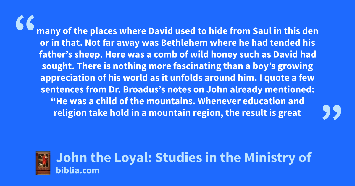 many of the places where David used to hide from Saul in this den or in that. Not far away was Bethlehem where he had tended his father’s sheep. Here was a comb of wild honey such as David had sought. There is nothing more fascinating than a boy’s growing appreciation of his world as it unfolds around him. I quote a few sentences from Dr. Broadus’s notes on John already mentioned: “He was a child of the mountains. Whenever education and religion take hold in a mountain region, the result is great