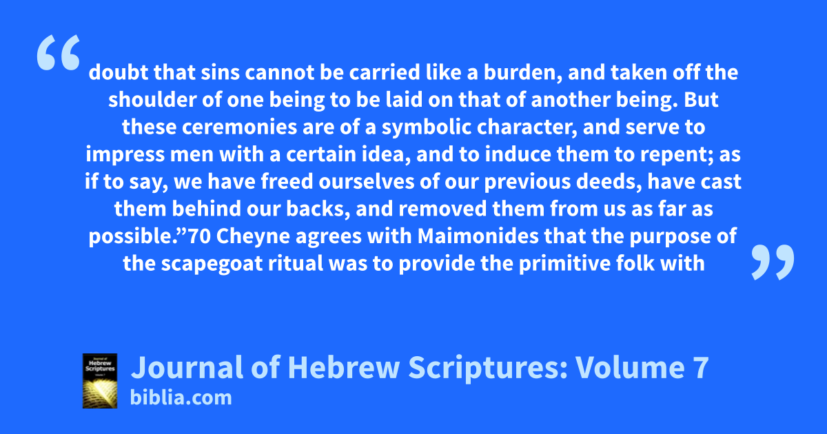 doubt that sins cannot be carried like a burden, and taken off the shoulder of one being to be laid on that of another being. But these ceremonies are of a symbolic character, and serve to impress men with a certain idea, and to induce them to repent; as if to say, we have freed ourselves of our previous deeds, have cast them behind our backs, and removed them from us as far as possible.”70 Cheyne agrees with Maimonides that the purpose of the scapegoat ritual was to provide the primitive folk with