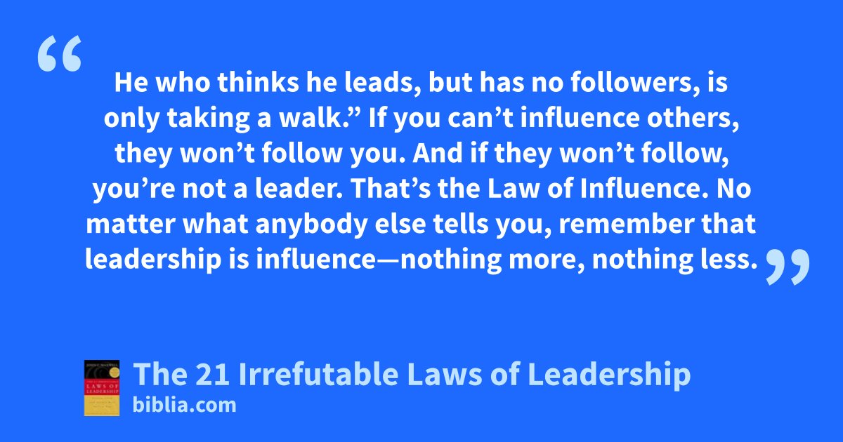 He who thinks he leads, but has no followers, is only taking a walk.” If you can’t influence others, they won’t follow you. And if they won’t follow, you’re not a leader. That’s the Law of Influence. No matter what anybody else tells you, remember that leadership is influence—nothing more, nothing less.