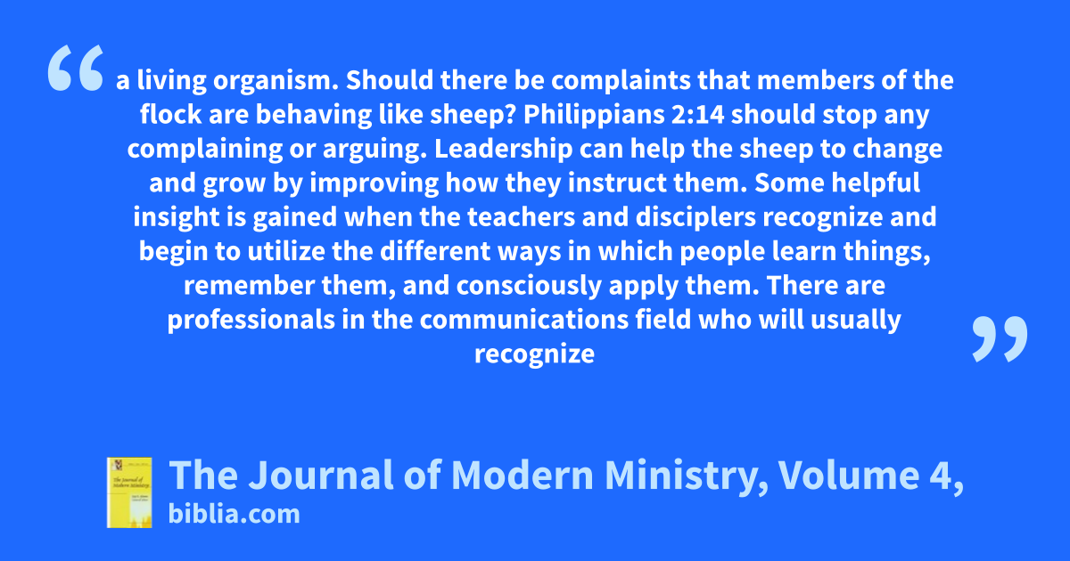 a living organism. Should there be complaints that members of the flock are behaving like sheep? Philippians 2:14 should stop any complaining or arguing. Leadership can help the sheep to change and grow by improving how they instruct them. Some helpful insight is gained when the teachers and disciplers recognize and begin to utilize the different ways in which people learn things, remember them, and consciously apply them. There are professionals in the communications field who will usually recognize