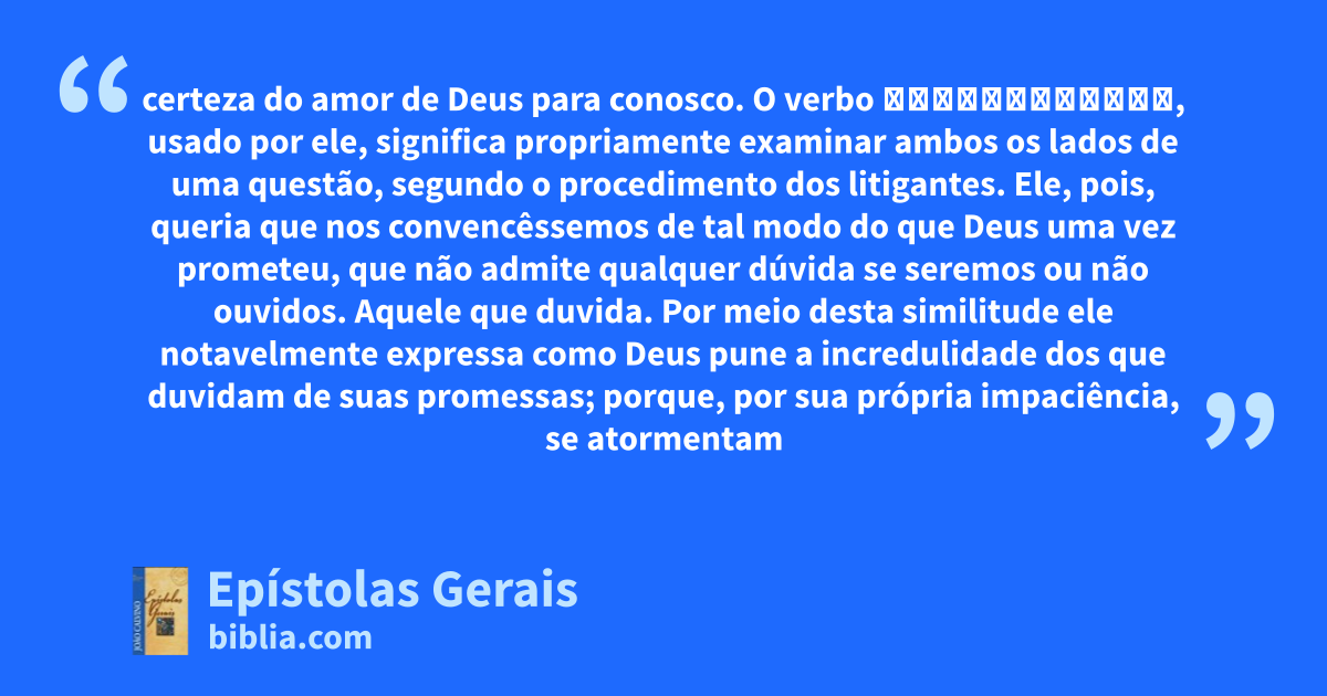 certeza do amor de Deus para conosco. O verbo διακρίνεσθαι, usado por ele, significa propriamente examinar ambos os lados de uma questão, segundo o procedimento dos litigantes. Ele, pois, queria que nos convencêssemos de tal modo do que Deus uma vez prometeu, que não admite qualquer dúvida se seremos ou não ouvidos. Aquele que duvida. Por meio desta similitude ele notavelmente expressa como Deus pune a incredulidade dos que duvidam de suas promessas; porque, por sua própria impaciência, se atormentam