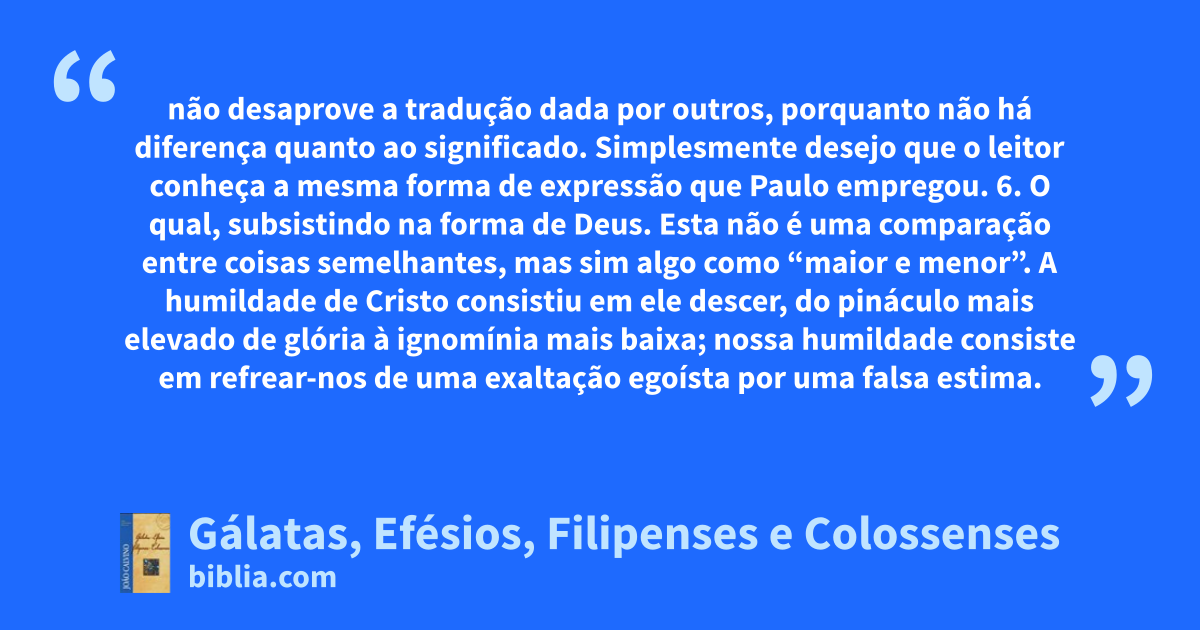 não desaprove a tradução dada por outros, porquanto não há diferença quanto ao significado. Simplesmente desejo que o leitor conheça a mesma forma de expressão que Paulo empregou. 6. O qual, subsistindo na forma de Deus. Esta não é uma comparação entre coisas semelhantes, mas sim algo como “maior e menor”. A humildade de Cristo consistiu em ele descer, do pináculo mais elevado de glória à ignomínia mais baixa; nossa humildade consiste em refrear-nos de uma exaltação egoísta por uma falsa estima.