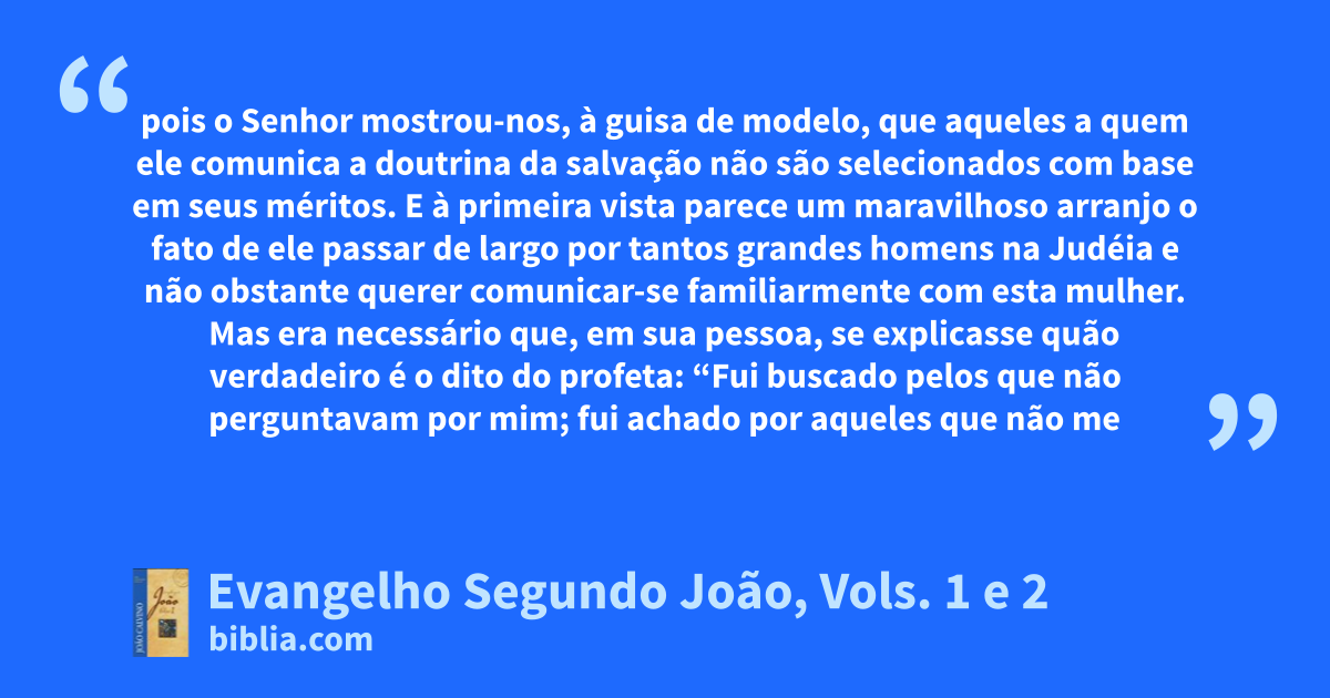 pois o Senhor mostrou-nos, à guisa de modelo, que aqueles a quem ele comunica a doutrina da salvação não são selecionados com base em seus méritos. E à primeira vista parece um maravilhoso arranjo o fato de ele passar de largo por tantos grandes homens na Judéia e não obstante querer comunicar-se familiarmente com esta mulher. Mas era necessário que, em sua pessoa, se explicasse quão verdadeiro é o dito do profeta: “Fui buscado pelos que não perguntavam por mim; fui achado por aqueles que não me