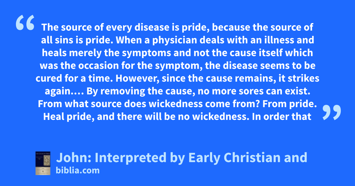 The source of every disease is pride, because the source of all sins is pride. When a physician deals with an illness and heals merely the symptoms and not the cause itself which was the occasion for the symptom, the disease seems to be cured for a time. However, since the cause remains, it strikes again.… By removing the cause, no more sores can exist. From what source does wickedness come from? From pride. Heal pride, and there will be no wickedness. In order that