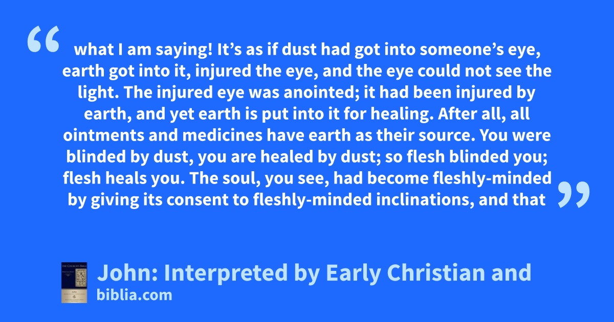 what I am saying! It’s as if dust had got into someone’s eye, earth got into it, injured the eye, and the eye could not see the light. The injured eye was anointed; it had been injured by earth, and yet earth is put into it for healing. After all, all ointments and medicines have earth as their source. You were blinded by dust, you are healed by dust; so flesh blinded you; flesh heals you. The soul, you see, had become fleshly-minded by giving its consent to fleshly-minded inclinations, and that