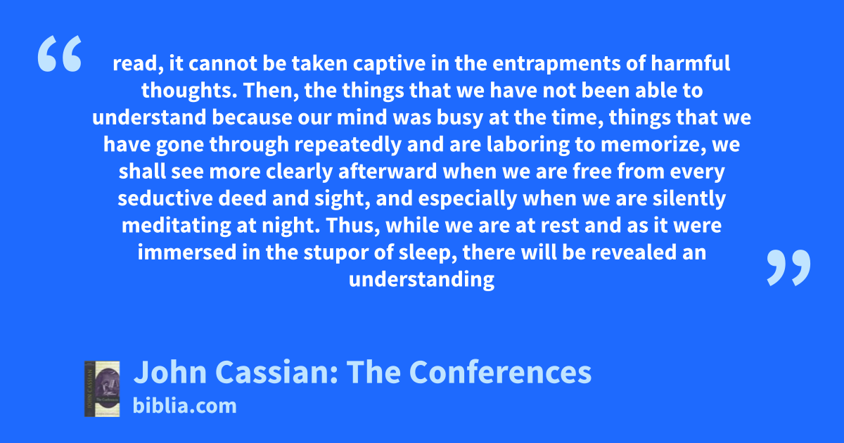 read, it cannot be taken captive in the entrapments of harmful thoughts. Then, the things that we have not been able to understand because our mind was busy at the time, things that we have gone through repeatedly and are laboring to memorize, we shall see more clearly afterward when we are free from every seductive deed and sight, and especially when we are silently meditating at night. Thus, while we are at rest and as it were immersed in the stupor of sleep, there will be revealed an understanding