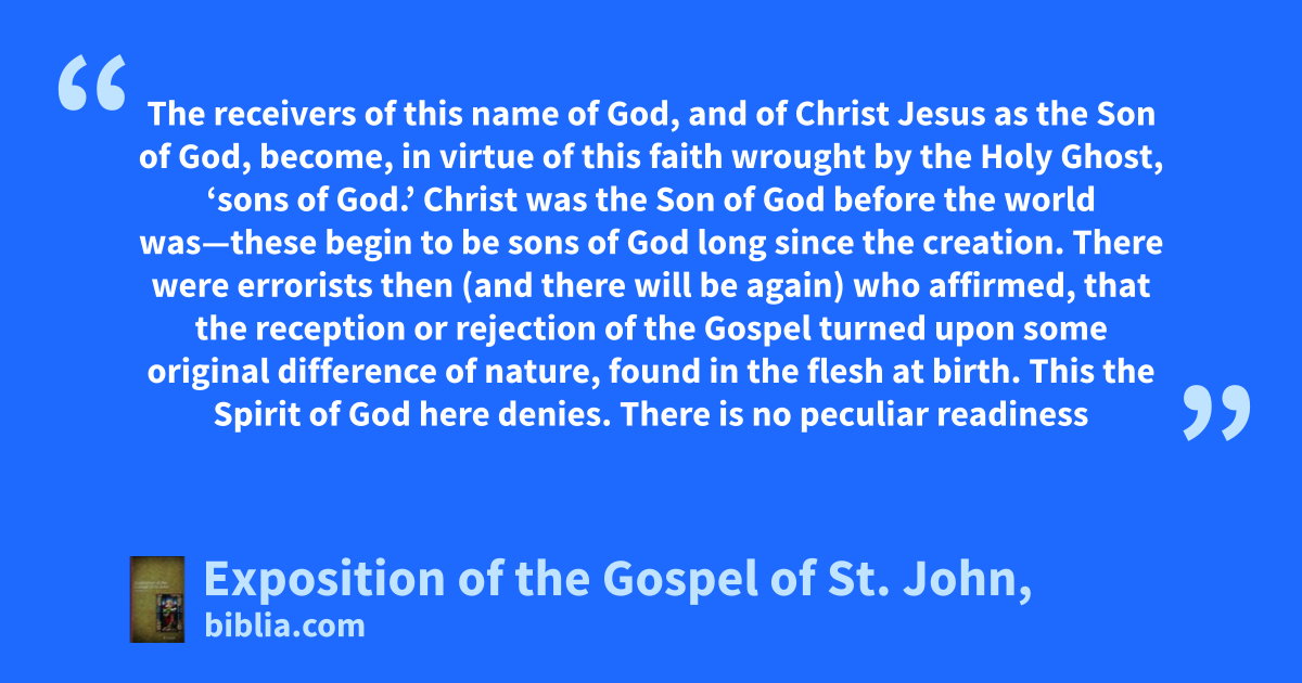 The receivers of this name of God, and of Christ Jesus as the Son of God, become, in virtue of this faith wrought by the Holy Ghost, ‘sons of God.’ Christ was the Son of God before the world was—these begin to be sons of God long since the creation. There were errorists then (and there will be again) who affirmed, that the reception or rejection of the Gospel turned upon some original difference of nature, found in the flesh at birth. This the Spirit of God here denies. There is no peculiar readiness