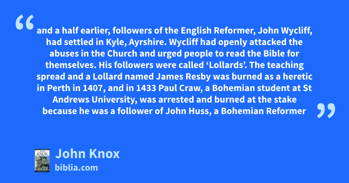 and a half earlier, followers of the English Reformer, John Wycliff, had settled in Kyle, Ayrshire. Wycliff had openly attacked the abuses in the Church and urged people to read the Bible for themselves. His followers were called ‘Lollards’. The teaching spread and a Lollard named James Resby was burned as a heretic in Perth in 1407, and in 1433 Paul Craw, a Bohemian student at St Andrews University, was arrested and burned at the stake because he was a follower of John Huss, a Bohemian Reformer