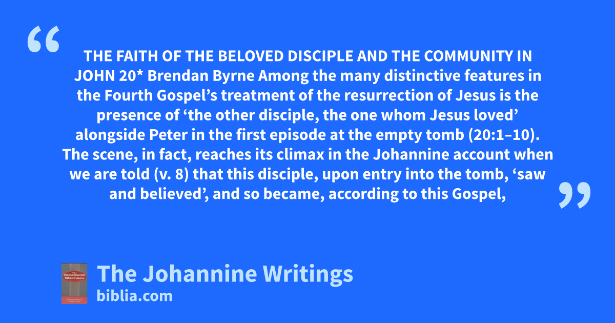 THE FAITH OF THE BELOVED DISCIPLE AND THE COMMUNITY IN JOHN 20* Brendan Byrne Among the many distinctive features in the Fourth Gospel’s treatment of the resurrection of Jesus is the presence of ‘the other disciple, the one whom Jesus loved’ alongside Peter in the first episode at the empty tomb (20:1–10). The scene, in fact, reaches its climax in the Johannine account when we are told (v. 8) that this disciple, upon entry into the tomb, ‘saw and believed’, and so became, according to this Gospel,