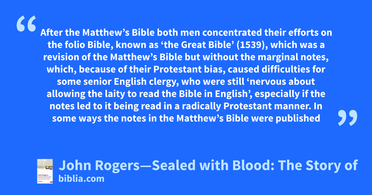 After the Matthew’s Bible both men concentrated their efforts on the folio Bible, known as ‘the Great Bible’ (1539), which was a revision of the Matthew’s Bible but without the marginal notes, which, because of their Protestant bias, caused difficulties for some senior English clergy, who were still ‘nervous about allowing the laity to read the Bible in English’, especially if the notes led to it being read in a radically Protestant manner. In some ways the notes in the Matthew’s Bible were published