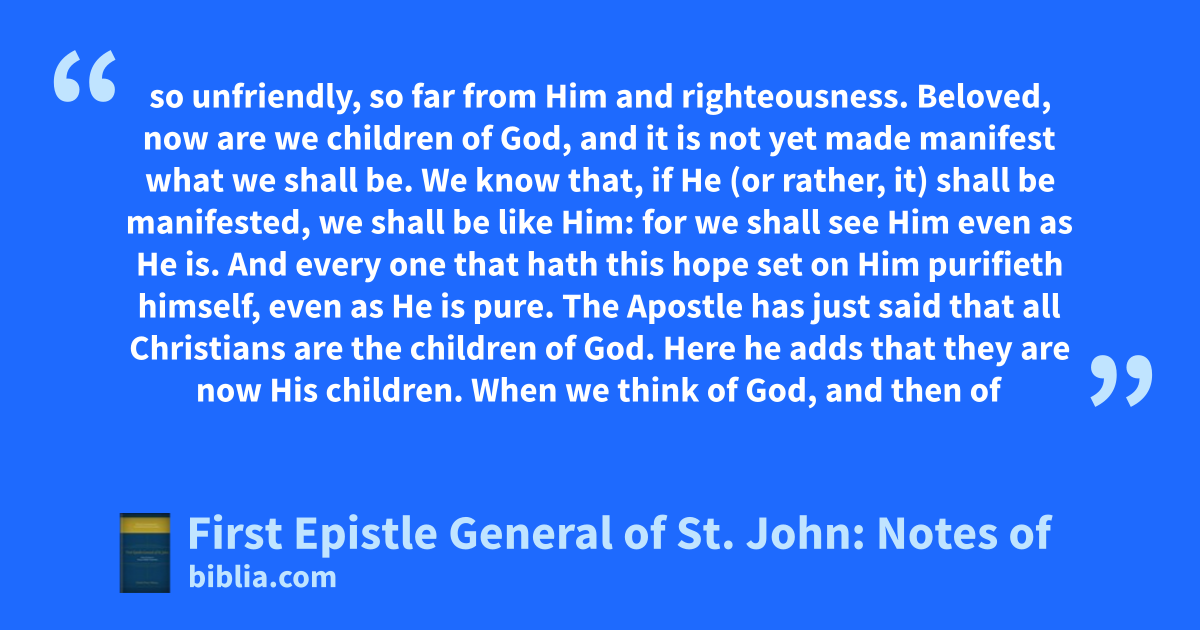 so unfriendly, so far from Him and righteousness. Beloved, now are we children of God, and it is not yet made manifest what we shall be. We know that, if He (or rather, it) shall be manifested, we shall be like Him: for we shall see Him even as He is. And every one that hath this hope set on Him purifieth himself, even as He is pure. The Apostle has just said that all Christians are the children of God. Here he adds that they are now His children. When we think of God, and then of