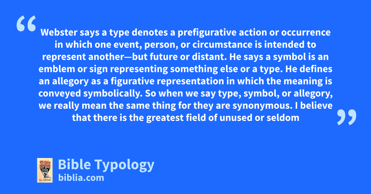Webster says a type denotes a prefigurative action or occurrence in which one event, person, or circumstance is intended to represent another—but future or distant. He says a symbol is an emblem or sign representing something else or a type. He defines an allegory as a figurative representation in which the meaning is conveyed symbolically. So when we say type, symbol, or allegory, we really mean the same thing for they are synonymous. I believe that there is the greatest field of unused or seldom