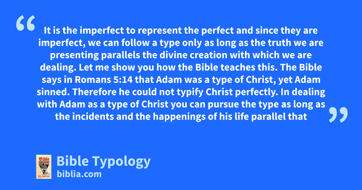 It is the imperfect to represent the perfect and since they are imperfect, we can follow a type only as long as the truth we are presenting parallels the divine creation with which we are dealing. Let me show you how the Bible teaches this. The Bible says in Romans 5:14 that Adam was a type of Christ, yet Adam sinned. Therefore he could not typify Christ perfectly. In dealing with Adam as a type of Christ you can pursue the type as long as the incidents and the happenings of his life parallel that