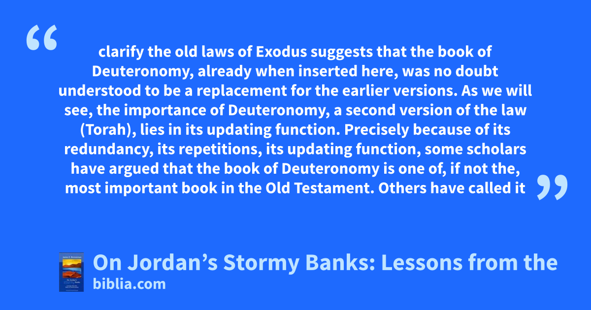 clarify the old laws of Exodus suggests that the book of Deuteronomy, already when inserted here, was no doubt understood to be a replacement for the earlier versions. As we will see, the importance of Deuteronomy, a second version of the law (Torah), lies in its updating function. Precisely because of its redundancy, its repetitions, its updating function, some scholars have argued that the book of Deuteronomy is one of, if not the, most important book in the Old Testament. Others have called it