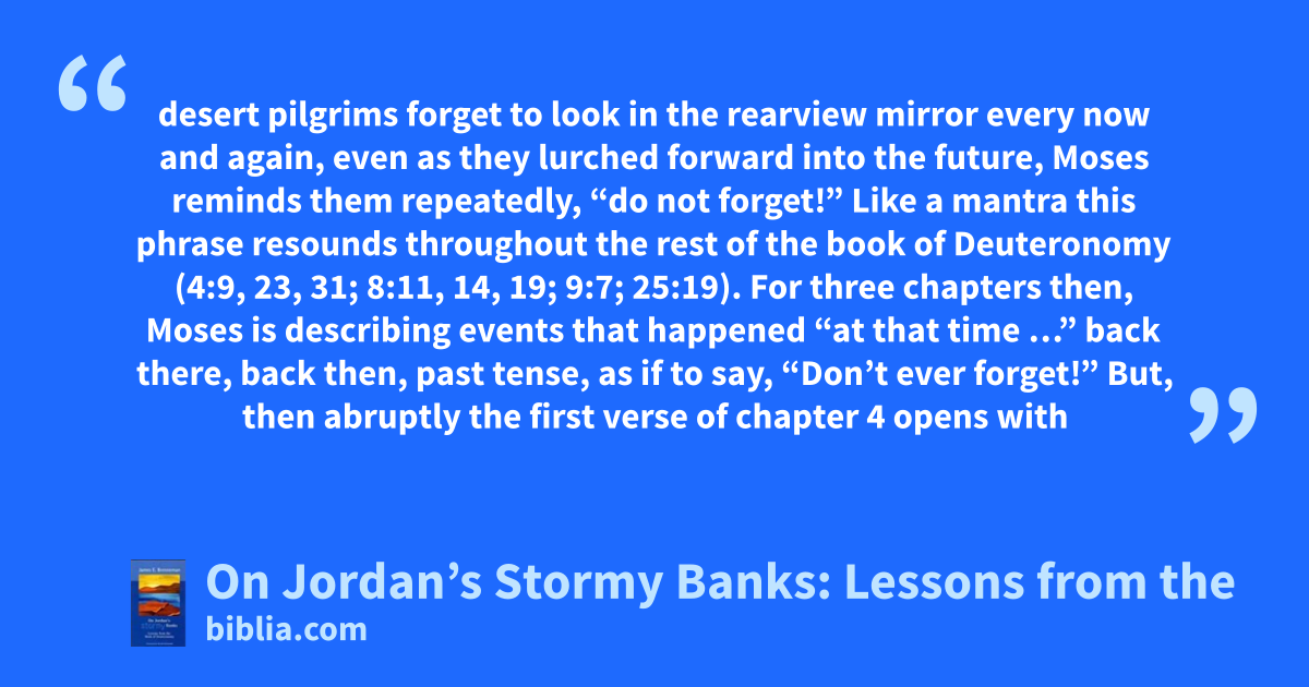 desert pilgrims forget to look in the rearview mirror every now and again, even as they lurched forward into the future, Moses reminds them repeatedly, “do not forget!” Like a mantra this phrase resounds throughout the rest of the book of Deuteronomy (4:9, 23, 31; 8:11, 14, 19; 9:7; 25:19). For three chapters then, Moses is describing events that happened “at that time …” back there, back then, past tense, as if to say, “Don’t ever forget!” But, then abruptly the first verse of chapter 4 opens with
