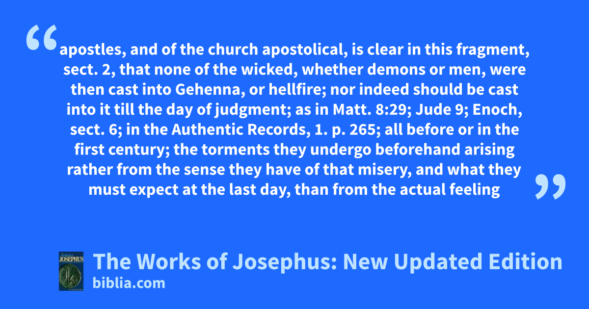 apostles, and of the church apostolical, is clear in this fragment, sect. 2, that none of the wicked, whether demons or men, were then cast into Gehenna, or hellfire; nor indeed should be cast into it till the day of judgment; as in Matt. 8:29; Jude 9; Enoch, sect. 6; in the Authentic Records, 1. p. 265; all before or in the first century; the torments they undergo beforehand arising rather from the sense they have of that misery, and what they must expect at the last day, than from the actual feeling