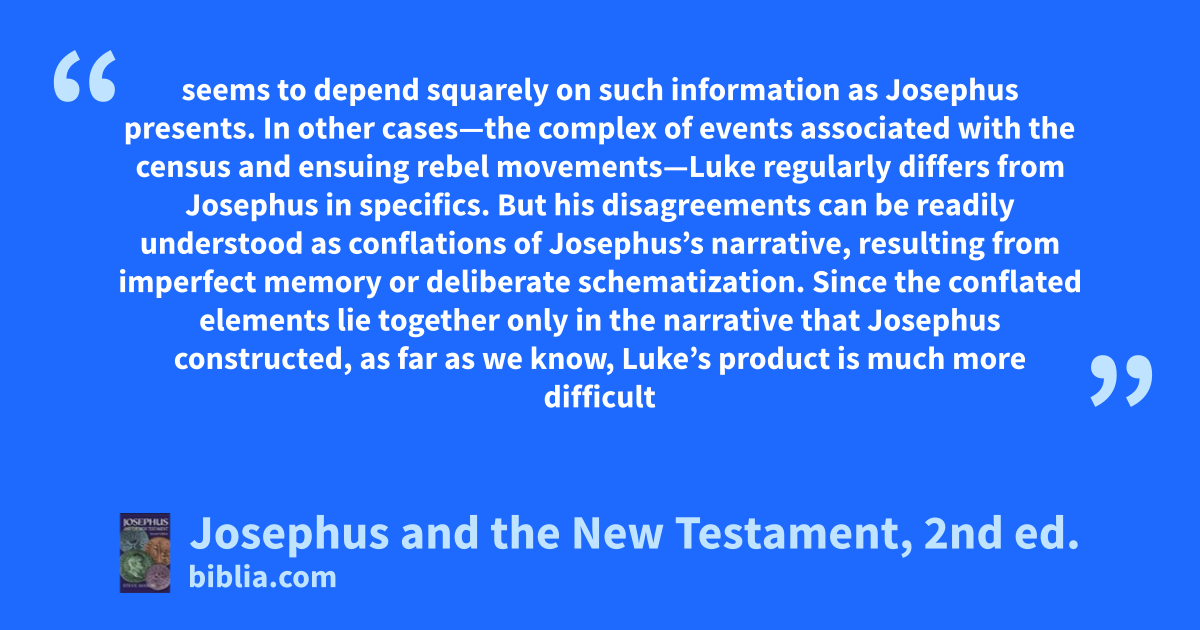 seems to depend squarely on such information as Josephus presents. In other cases—the complex of events associated with the census and ensuing rebel movements—Luke regularly differs from Josephus in specifics. But his disagreements can be readily understood as conflations of Josephus’s narrative, resulting from imperfect memory or deliberate schematization. Since the conflated elements lie together only in the narrative that Josephus constructed, as far as we know, Luke’s product is much more difficult