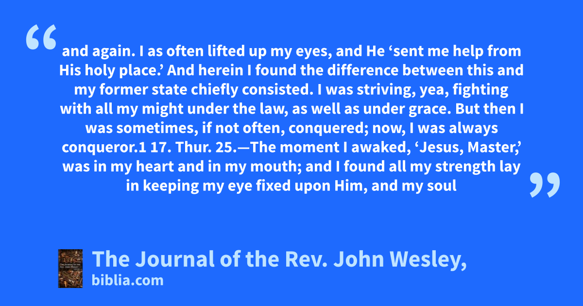 and again. I as often lifted up my eyes, and He ‘sent me help from His holy place.’ And herein I found the difference between this and my former state chiefly consisted. I was striving, yea, fighting with all my might under the law, as well as under grace. But then I was sometimes, if not often, conquered; now, I was always conqueror.1 17. Thur. 25.—The moment I awaked, ‘Jesus, Master,’ was in my heart and in my mouth; and I found all my strength lay in keeping my eye fixed upon Him, and my soul