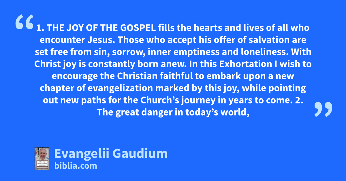 1. THE JOY OF THE GOSPEL fills the hearts and lives of all who encounter Jesus. Those who accept his offer of salvation are set free from sin, sorrow, inner emptiness and loneliness. With Christ joy is constantly born anew. In this Exhortation I wish to encourage the Christian faithful to embark upon a new chapter of evangelization marked by this joy, while pointing out new paths for the Church’s journey in years to come. 2. The great danger in today’s world,