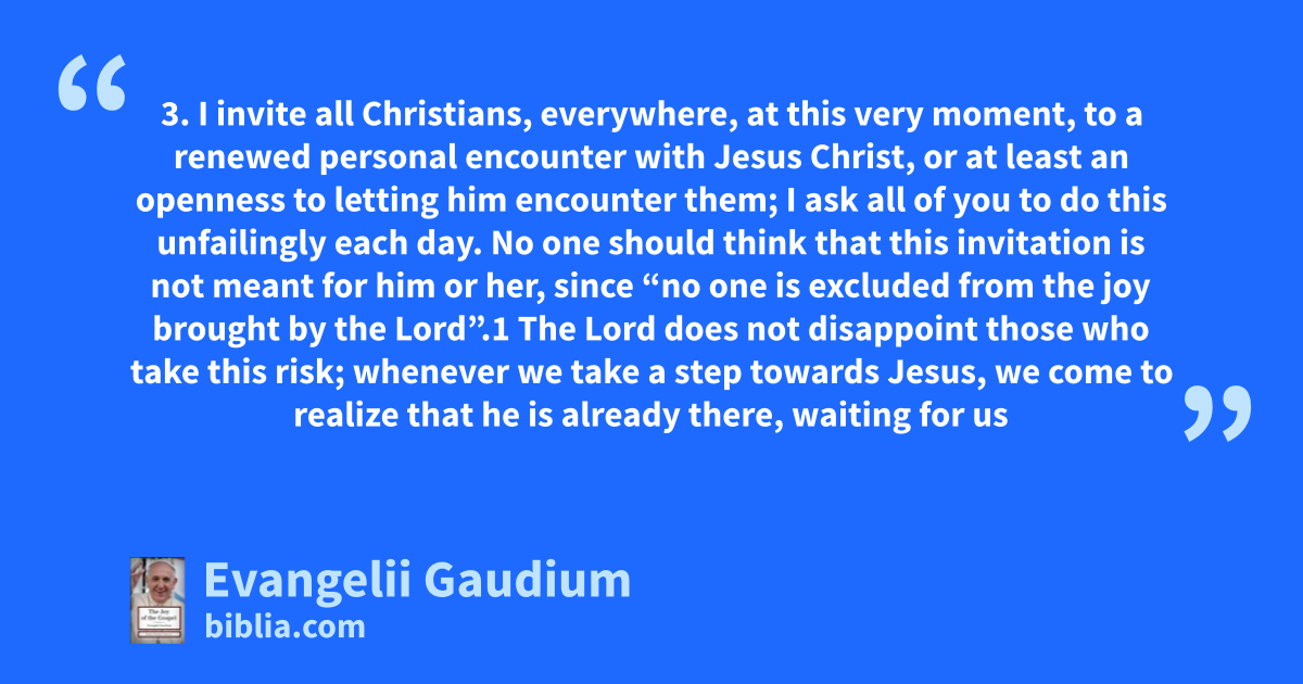 3. I invite all Christians, everywhere, at this very moment, to a renewed personal encounter with Jesus Christ, or at least an openness to letting him encounter them; I ask all of you to do this unfailingly each day. No one should think that this invitation is not meant for him or her, since “no one is excluded from the joy brought by the Lord”.1 The Lord does not disappoint those who take this risk; whenever we take a step towards Jesus, we come to realize that he is already there, waiting for us