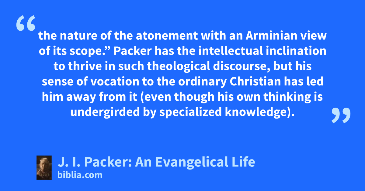 the nature of the atonement with an Arminian view of its scope.” Packer has the intellectual inclination to thrive in such theological discourse, but his sense of vocation to the ordinary Christian has led him away from it (even though his own thinking is undergirded by specialized knowledge).