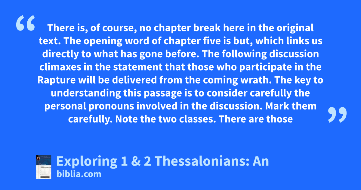 There is, of course, no chapter break here in the original text. The opening word of chapter five is but, which links us directly to what has gone before. The following discussion climaxes in the statement that those who participate in the Rapture will be delivered from the coming wrath. The key to understanding this passage is to consider carefully the personal pronouns involved in the discussion. Mark them carefully. Note the two classes. There are those